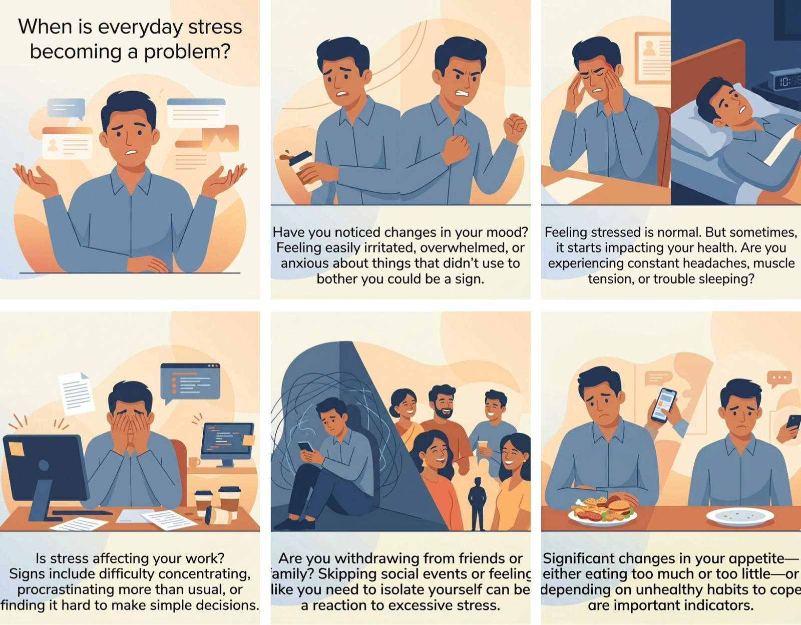 Everyday stress is a part of life, but sometimes it begins to affect mental and physical well-being in a deeper way. If you notice frequent irritability, anxiety, or feeling overwhelmed by situations that were once manageable, it may be a sign that stress is building up. Ongoing stress can also show up through headaches, muscle tension, poor sleep, or constant tiredness. At work, it may lead to difficulty concentrating, procrastination, or trouble making simple decisions. Some people begin to withdraw from family and friends without fully realising why. Changes in appetite, either eating too much or too little, can also be linked to stress. When these patterns continue, they should not be ignored. Stress does not always look dramatic, but it can still affect daily functioning and quality of life. Recognising these signs early can help prevent further emotional strain. Seeking timely support can make a meaningful difference.